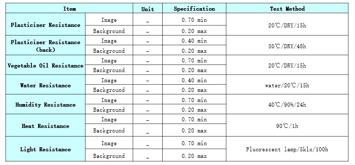 Product Caliper(μm) Heat Resistance Light Resistance Dynamic Sensitivity